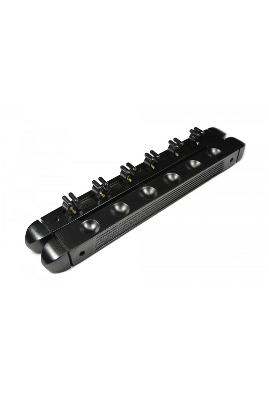 Black wooden wall-cue rack for 6 cues