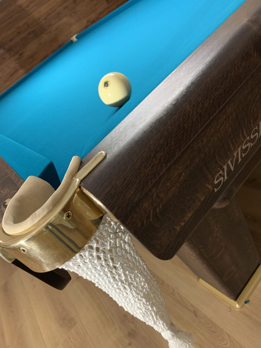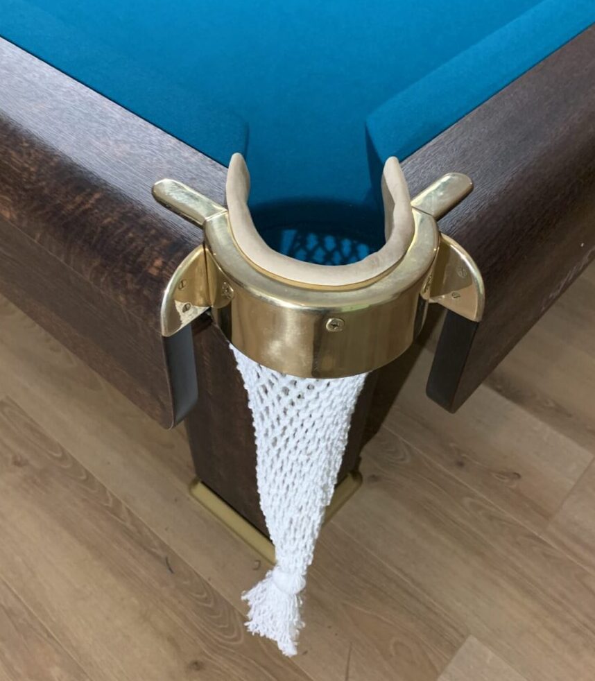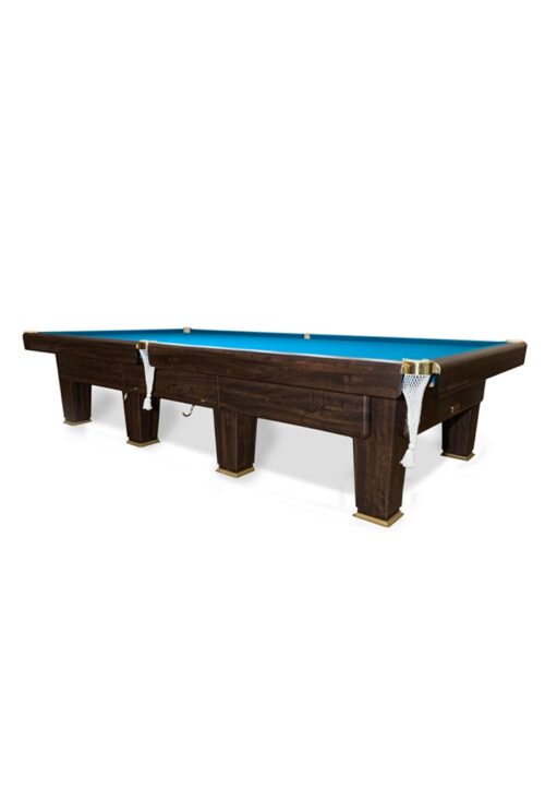 Τραπέζι μπιλιάρδου Ρωσικής πυραμίδας (Russian Pyramid), επενδεδυμένο με άκαυστο HPL Post forming σε χρώμα σκούρο καφέ με μεταλλικές λεπτομέρειες (γωνίες τσέπης, τάσια ποδιών) σε καφέ ή σε χρυσαφί χρώμα.